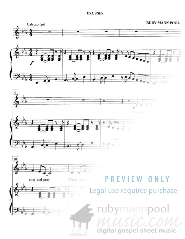 EXCUSES – Solo with reggae flavor and optional audience participation. This humorous song tells about the excuses people give for not going to church!