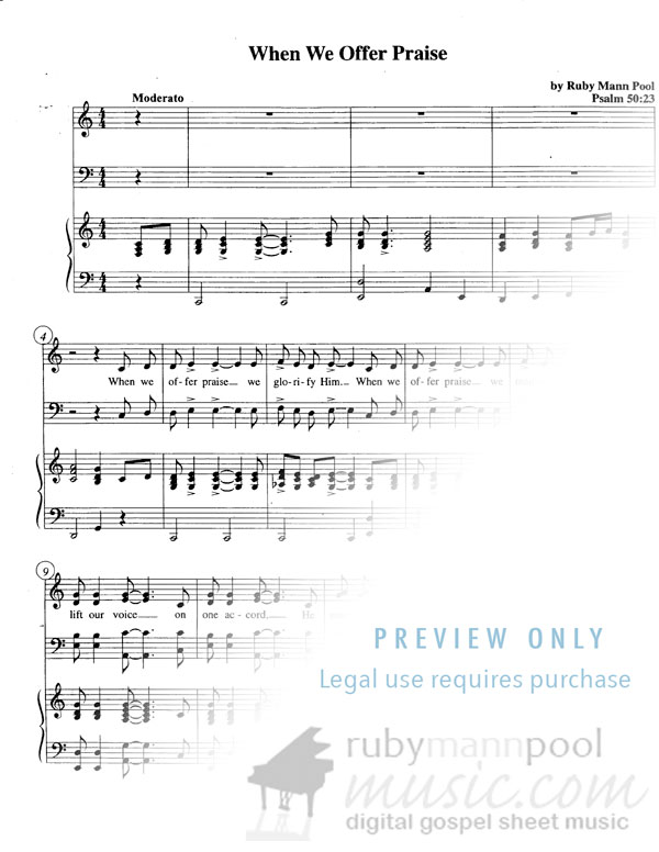 WHEN WE OFFER PRAISE – Can be sung SATB or SAT. No lead part, moderate tempo, joyful sound. Pay close attention to accents. Based on Psalm 50:23